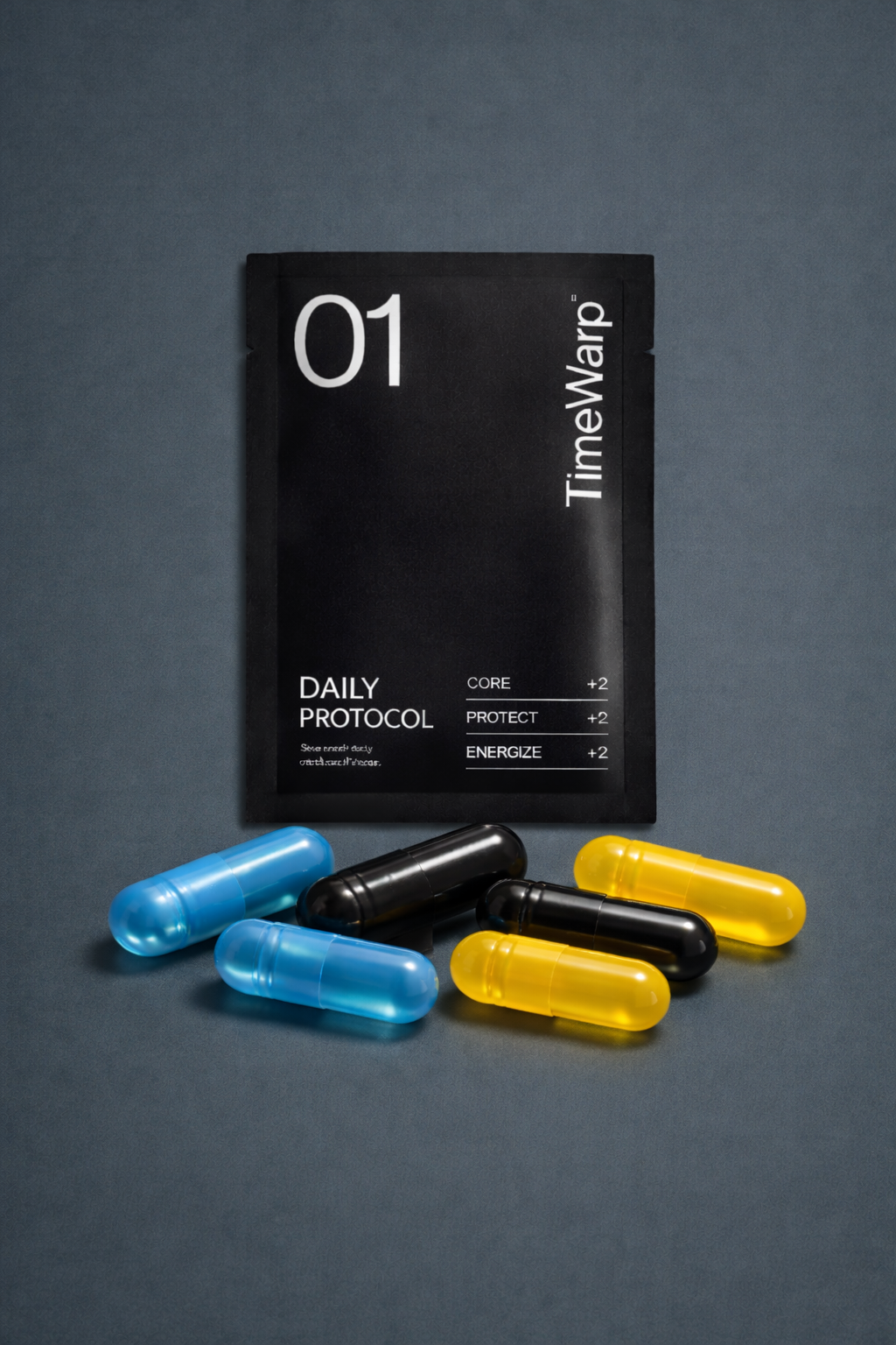 The TimeWarp Longevity Protocol is a structured daily supplement system designed to support the biological processes that influence aging and long term health.